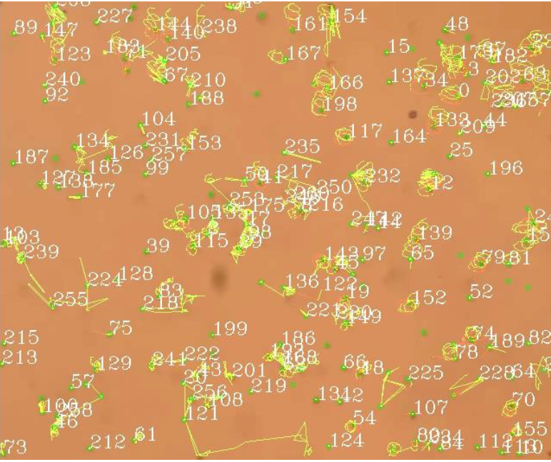 この実験では磁性粒子としてカルボキシ基COOHを、検出する標的物質としてアミノ基NH2を用いました。COOHは、それ単体の状態で電気を流し制御すると、小さな円を描くように規則的に動くことが確認されました。下記図の緑色の線は磁性粒子の動きを追跡し表示したものです。(下記図5)