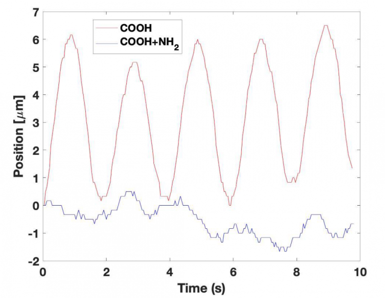 下記図7はCOOHのみの溶液(赤線)とCOOHとNH2を混合した溶液(青線)それぞれの溶液内の粒子の動きの振幅量を示したグラフです。NH2を含む溶液内の粒子の動きが明らかに低減していることが確認できます。
