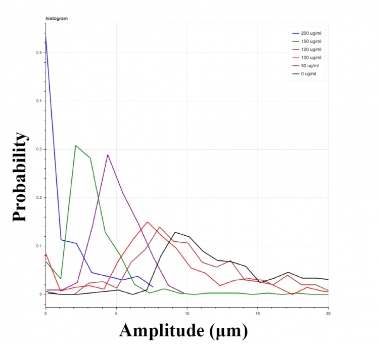 下記図8はNH2粒子の濃度を変化させた際の振幅分布を示したものです。NH2の濃度が高くなるに従い振幅ピークが減少していることが確認できました。