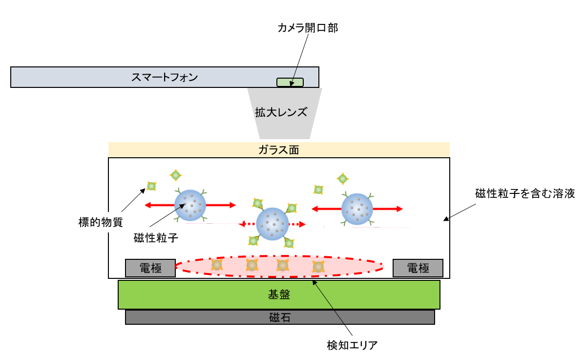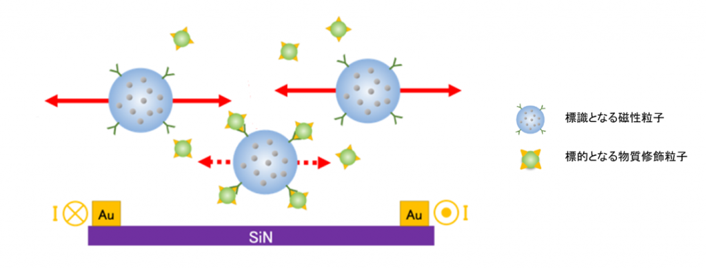 本技術は蛍光体の代わりに直径約250ナノメートルの微小な磁性粒子を標識として使うことで、ターゲットとなる物質に磁性粒子が素早く結合し、その粒子の挙動の変化をスマートフォンのカメラを利用し観察することで簡単かつ迅速に物質を検出することができるというものです。