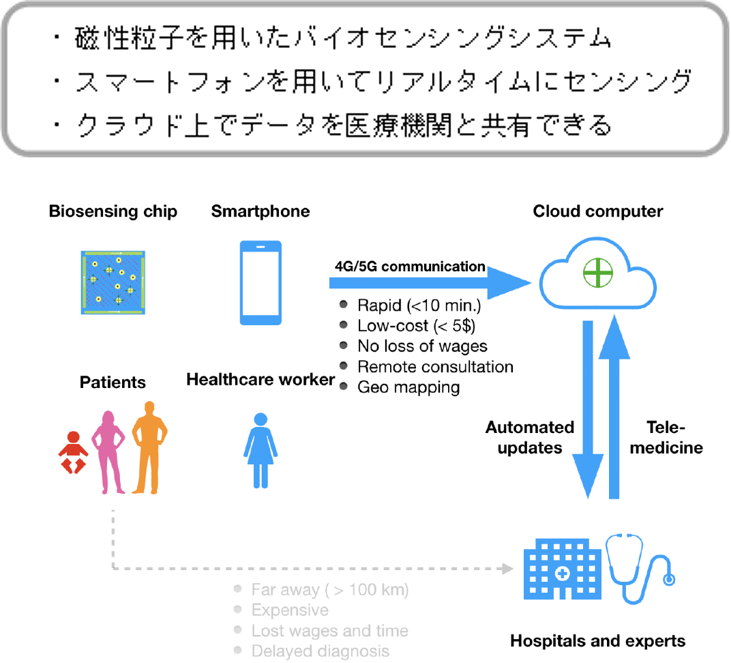 磁性粒子を標識に用いた、スマートフォンのカメラと組み合わせて使えるバイオセンシングシステムを開発致しました。溶液内の磁性粒子の動き・挙動を観察することで生体物質の検出を行います。装置が小型で操作に専門知識も必要としない上、ほんの数分で標的物質の検出することが可能です。本技術を用いれば、インフラの整っていない地域であってもスマホさえあれば手軽に血液や唾液、尿などからガンなどの病気を自己診断することができます。また本技術で撮影したデータを、スマートフォンを用いリアルタイムにクラウド上で医療機関と共有することで、より精度が高く迅速な遠隔医療の実現に貢献する可能性があります。 |