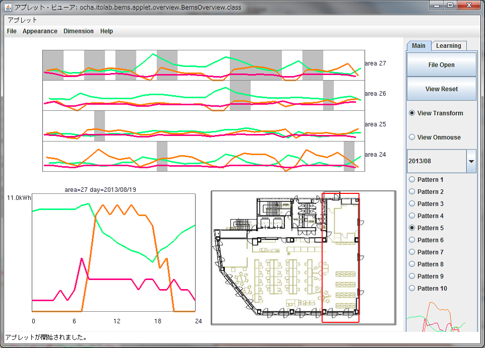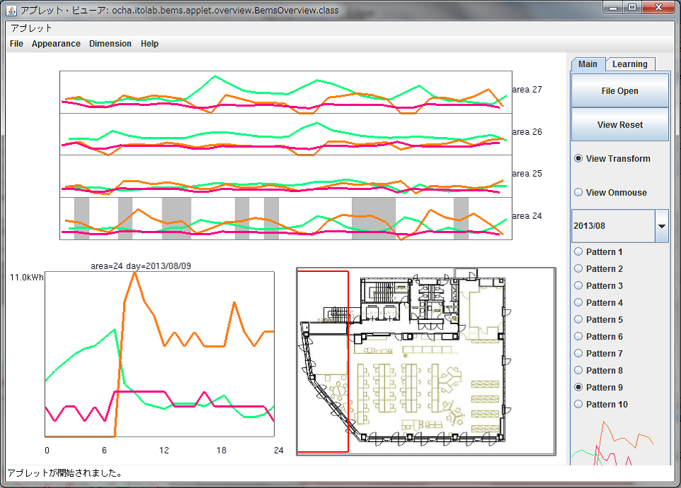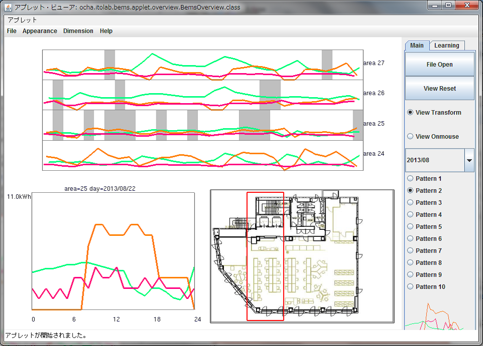 当研究室で提案する新しい可視化ソフトウェアでは、時間軸について1日でも1月でも1年でも一覧できるマルチスケールな観察が可能です。また、フロアの全体図からエリアを取り出し(右下の平面図の赤枠内)、エリアごとのデータの推移を可視化することでエリアごとの特徴や問題を把握できます。