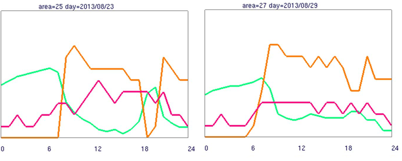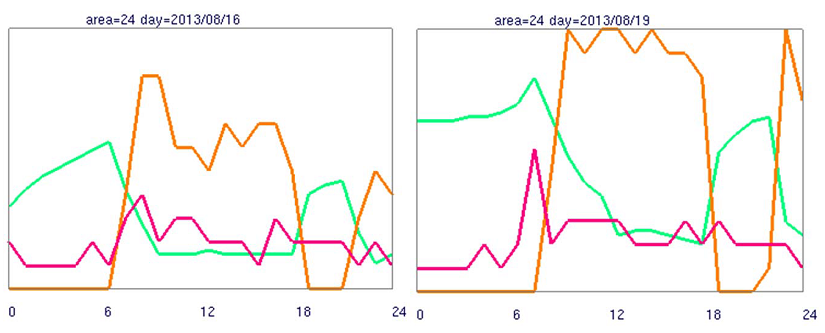 2ではこのようなパターンを機械的に抽出します。最上部のパネルに灰色で示されているのがそのようなパターンに該当するものです。一般的にオフィスエリアでは異常な現象ではありませんが、抽出された日とエリアごとにそれが異常か否かを観察します。