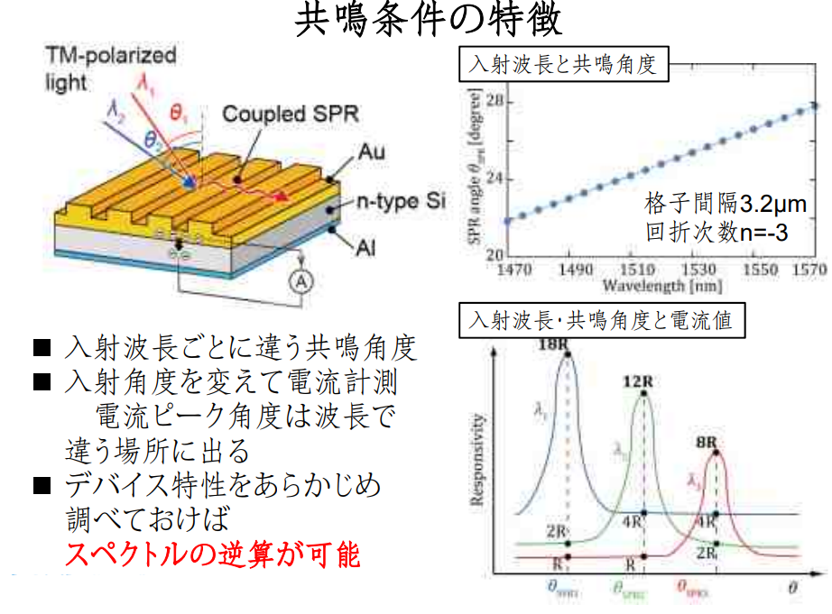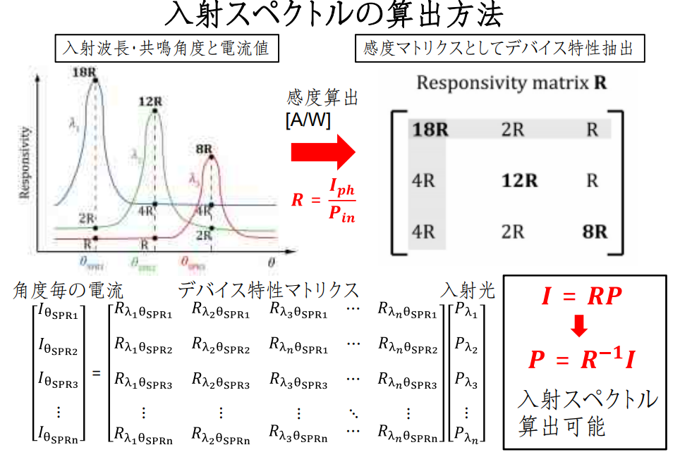 ディテクタで検出する電流値のピークは、入射する光の波長・角度およびデバイス(Si)の特性によって決まります。逆に言えば、デバイスの特性と、光が照射されたときの電流値ピークの特性をあらかじめデータベース化しておけば、入射する光の波長・角度を逆行列によって導き出す(スペクトルの逆算)ことができます。