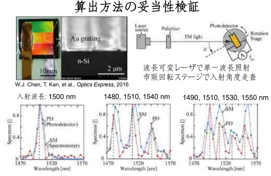 ■本手法による分光器の測定精度の妥当性は、波長可変レーザおよび回転ステージによる入射角度の走査機構を用いて検証しています。