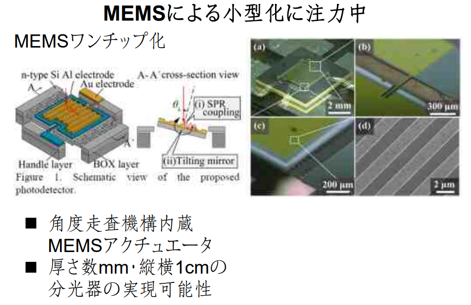 ■従来の小型分光器は、回折格子で分けた光をフォトディテクタで検出しています。そのため、光を分散させるために光路長が必要であり、小型化に限界がありました。本技術では、電流値を測定するディテクタを用いており、デバイスとして一体化しているため、その課題を解決しています。また、入射角度を操作するためのアクチュエータも内蔵したワンチップ化を実現しています(MEMSアクチュエータ以外にも入射角度を操作する手法も検討しています)。厚さ数mm・縦横1cm程度の分光器の実現可能性について目途が立っています。