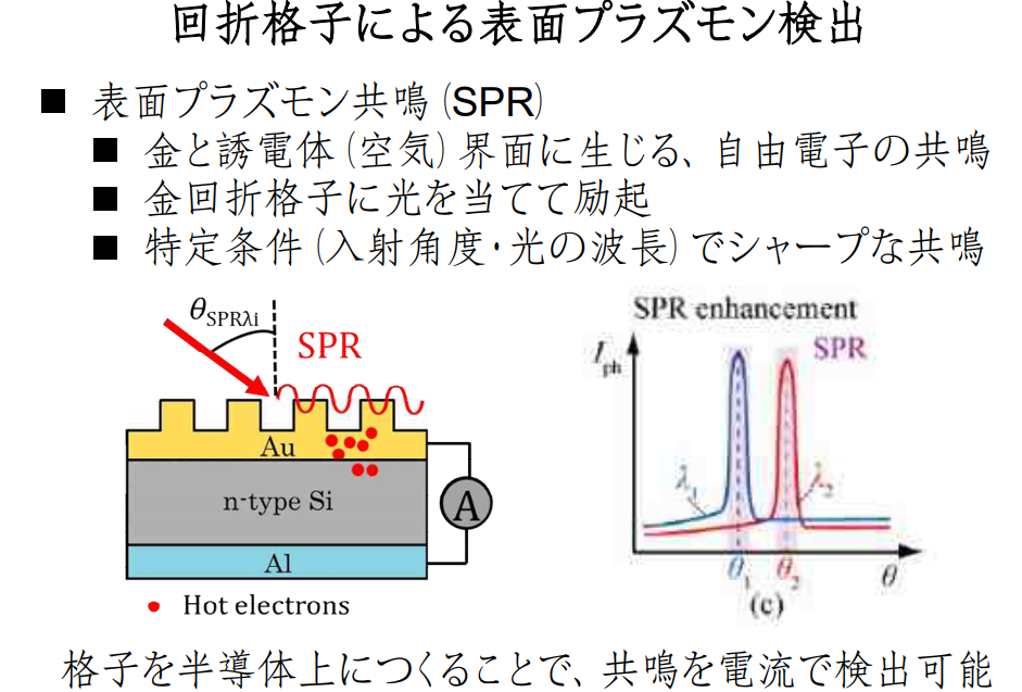 光が当たったときの入射角・光の波長の条件によって、表面プラズモン現象による共鳴が発生し、その共鳴によって生じた電流をディテクタ(検出器)で測定します。