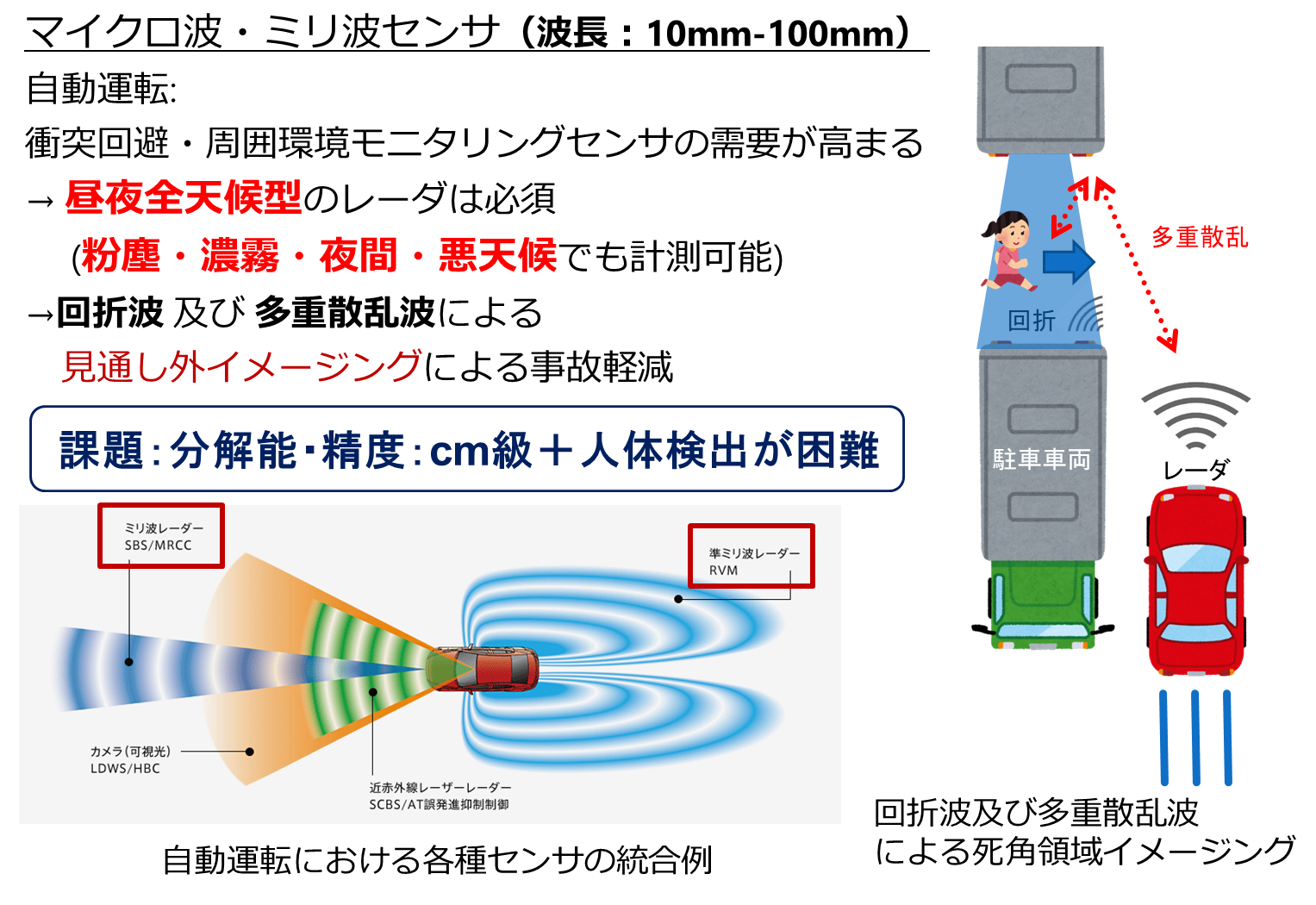 また、波長が長いレーダは見通し外も回折して観測可能なため、例えば車載レーダなどにも応用可能です。本研究を活用した製品開発に意欲がある企業を歓迎いたします。