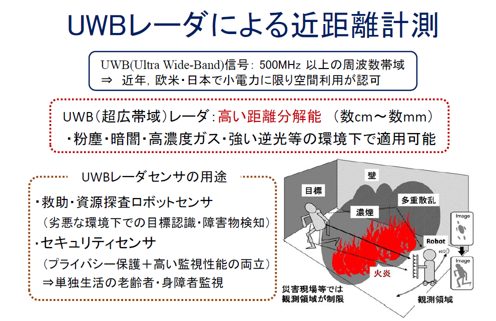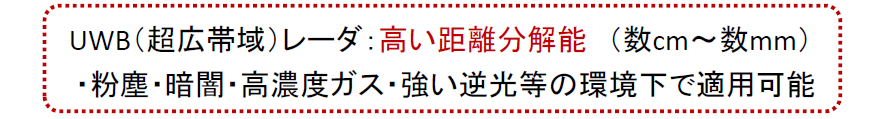 UWBレーダは高い距離分解能のほか、粉塵・暗闇・高濃度ガス・強い逆行等の環境下でも適用可能です。その特徴を生かして救助・資源探査ロボットセンサ等への適用可能性があります。屋内・屋外でも利用可能です。