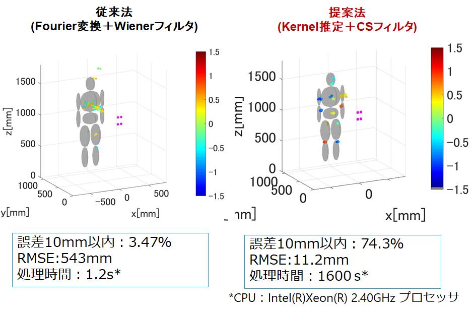 同技術は特に超分解能距離推定法である圧縮センシング(Compressed Sensing :CS)フィルタとの相性が非常に良い手法です。本研究では、kernel推定とCSフィルタという独自の信号処理技術により、ドップラー推定を高精度に行うことで、人の挙動をより細かく把握することができます。
