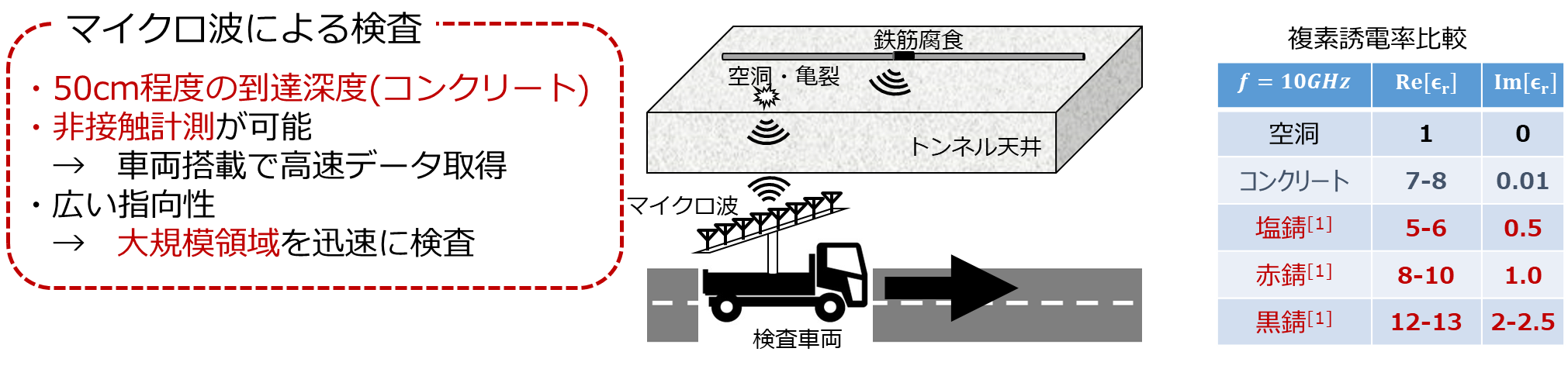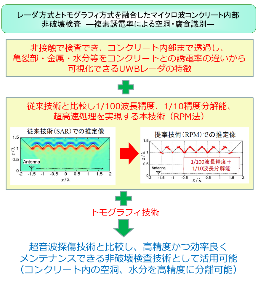 本技術では、UWBレーダの特徴として非接触かつ広範囲かつコンクリートへの透過性があり(内部まで点検でき)、かつRPM法とトモグラフィ技術を用いることで誘電率の情報を抽出することができ、他の技術に対する優位性があります。