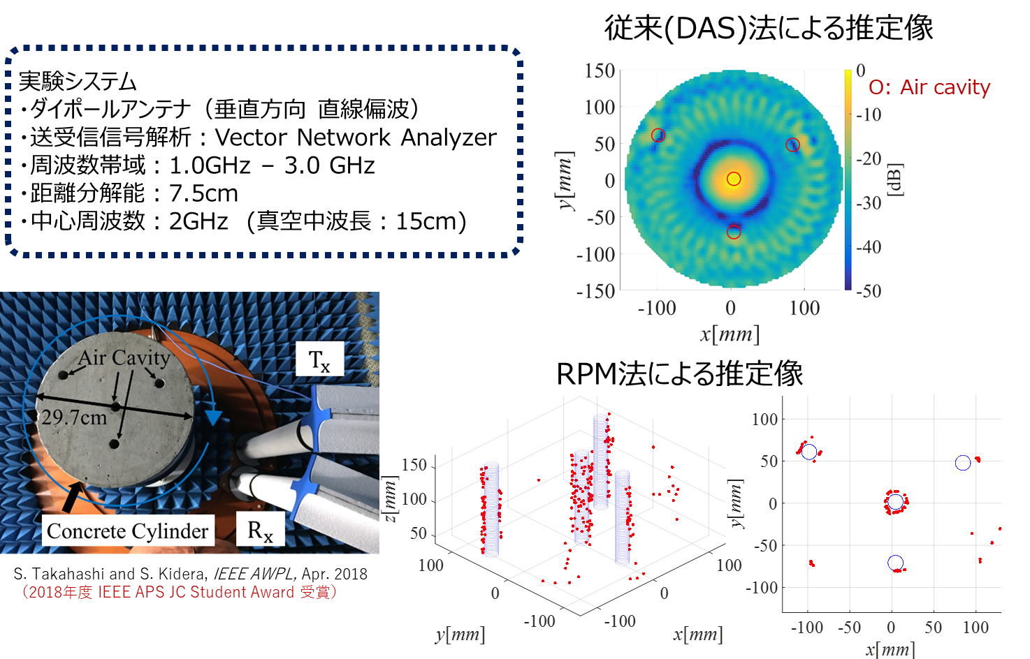 RPM法は内部画像化に適した手法です。下の図は、円柱状のコンクリート内部に直径数㎜程度の円筒型空洞を4本入れた場合における実験的な評価です.右上図は、従来のSAR法による像ですが、位相不確定性による虚像(False Image)が発生する上に空洞境界部分がぼやけており、分解能が十分でないことがわかります。また計算時間も膨大であることが確認されています。右下図はRPM法による推定像で、RPM法を内部画像化用途に拡張すると虚像が発生せず境界面に沿って可視化できます。また形状も非常に高精度に推定することができます。そのため高精度に内部状態を点検することが可能です。