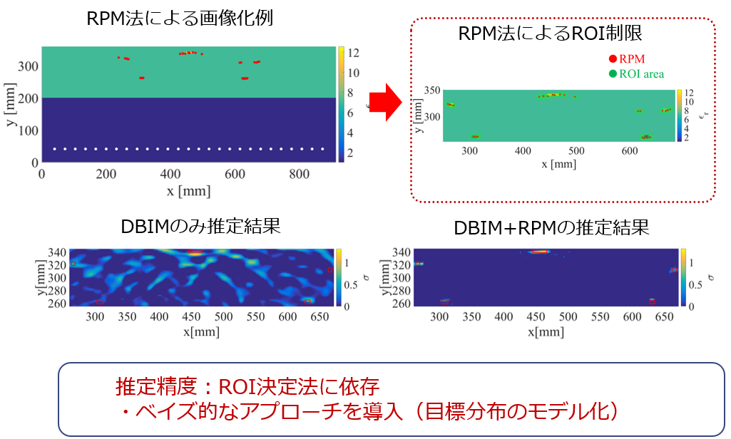 その際、ROIデータをいかに精度よく絞るかが重要ですが、本研究ではベイズ的アプローチを用いて高精度にROIを推定することに成功しています。UWBレーダ・RPM法とトモグラフィ技術を組み合わせることによりコンクリート内の空洞と鉄筋腐食にに相当する誘電率及び導電率を高精度に再現できていることがわかります。