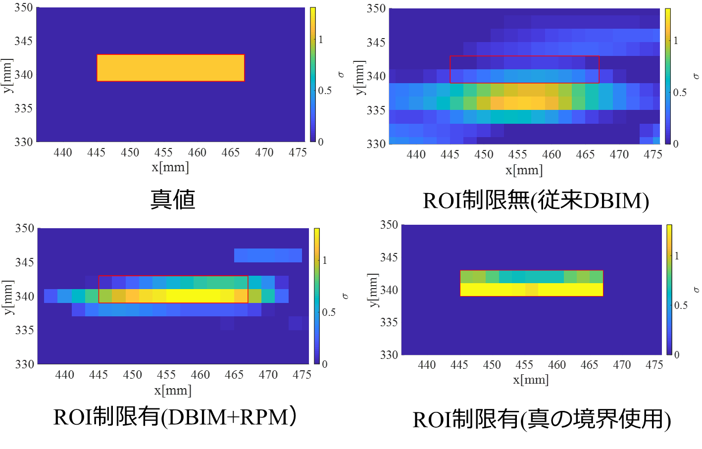特に下の図は、さび付近の誘電率推定の結果をズームアップしたものです。左上の真値に対して、ROI制限なしのトモグラフィ法(DBIM法)の結果では、誘電率値や形状位置がずれているのに対して、RPM法を統合した結果であると本来の位置に凡そ正しい誘電率値が再現できていることがわかります。