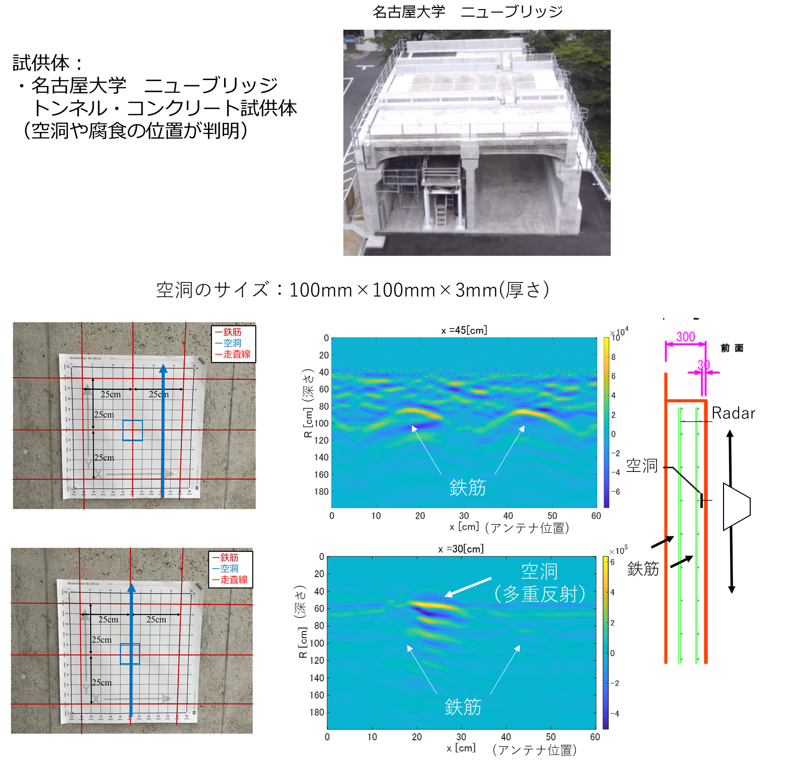 このほか、下の図にあるように、名古屋大学でのトンネル試供体を用いた実験を実施しています。同試供体では、恣意的に空洞がコンクリート内部に入れられており、そのサイズや場所がわかっているため、定量的な検証が可能になります。また下の図では空洞が入っていない場合(上)と、入っていない場合(下)を見ると、厚さ3mm程度の空洞であっても、鉄筋から有意な反射が得られており、レーダにより異物の探知が可能であることが裏付けられます。